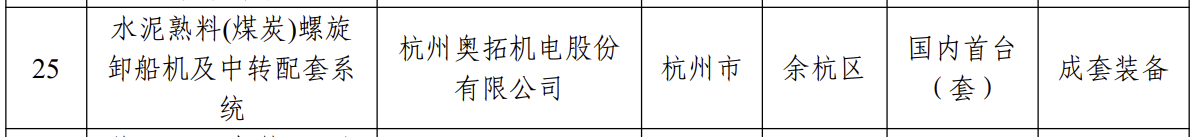 Recent, „Cinkerul de ciment (cărbune) S echipajul Sistem de descărcare a navelor și sistem de transfer suport", dezvoltat independent de HangZhou Aotuo Mechanical And Electrical CO., LTD. (denumit în continuare „AOTUO”), a fost recunoscut cu succes ca fiind primul echipament de acest fel din China. Acest echipament aparține sectorului industriei de echipamente de ultimă generație, care este o prioritate cheie susținută de stat. Acesta abordează golurile și umple golurile din logistica portuară. Printr-o evaluare organizată de Federația Industriei de Mașini din Zhejiang, comitetul de evaluare a concluzionat în unanimitate că „realizarea demonstrează dificultate tehnică semnificativă, inovație puternică, iar tehnologia generală se află la un nivel avansat internațional, cu acordul aprobării acesteia”.